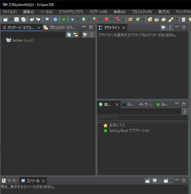 twitterを右クリックし、メニューから[実行]-[Spring Bootアプリケーション]を選択する。