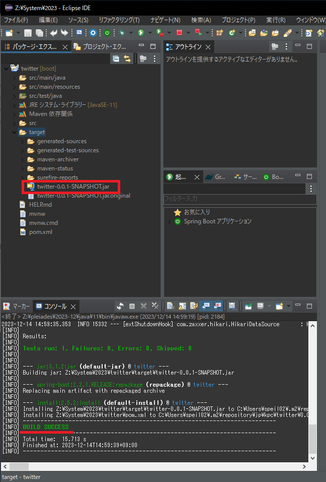 - コマンドプロンプトで「java -jar twitter-0.0.1-SNAPSHOT.jar」を実行する。